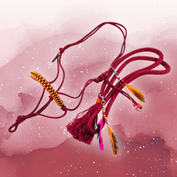 Das Knotenhalfter sowie der Halsstrick sind in elegantem Bordeaux gehalten. Das verzierte Nasenstück kombiniert Bordeaux, Ocker und Orange und setzt harmonische Akzente. Zwei farblich passende Federclips runden das Set optisch und praktisch ab.