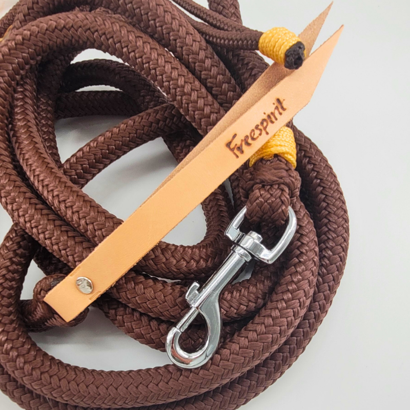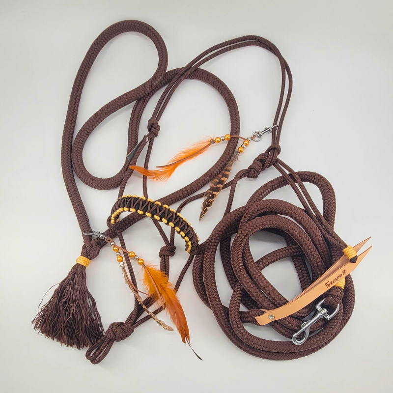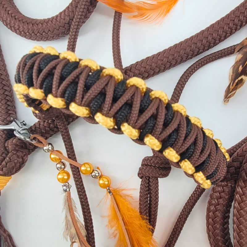Das braune Knotenhalfter ist mit einer dreifarbigen, geknoteten Nase in Braun, Gold & Schwarz verziert. Ergänzt wird das Set durch einen farblich passenden Halsstrick in Braun mit Federclip sowie ein Bodenarbeitsseil mit 3,7 m Länge, ebenfalls in Braun.